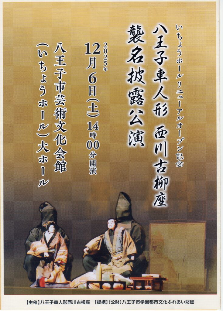 八王子車人形 西川古柳座の襲名披露公演を見に行った。車人形は、よく見に行くが、若手人形師の襲名披露とあって、多くのファンが集まった。いわゆる、文楽・人形浄瑠璃であるが、人形遣いが小さな車付きの台(ろくろ車)に座り、一人で人形を操作する。人形の足が、人形遣いの足と直接つながり、足が床から浮いている文楽では表現が難しいであろう人形の足で床をたたく動作が表現できる。また、一人で人形を操作することから、いろいろな工夫がなされてる。